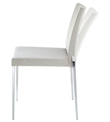 Esta silla, que además es apilable, está fabricada en acero cromado y tanto el asiento como el respaldo son tapizados.