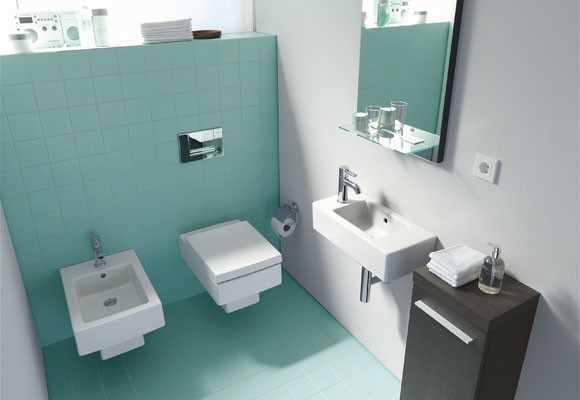 En el baño que hoy os mostramos podéis ver como el suelo y parte de la pared se ha revestido con azulejos de este color mint. Son azulejos de diseño tradicional con un color de moda.