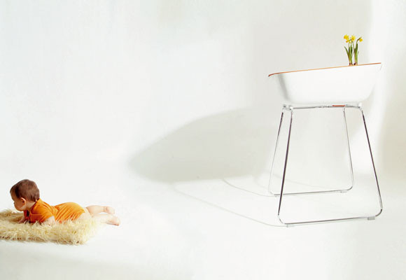 La cubeta es una superficie continua, con un aire retro que oculta formas y soluciones muy sofisticadas. El color de la bañera contrasta en color con el cambiador, que se presenta en varios colores. La bañera se apoya sobre unas patas metálicas que se pliegan de una forma muy sencilla para guardar las bañera en un pequeño espacio como el que queda detrás de la puerta.