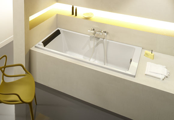 Gracias al dorsal elevado y su cojín extraíble, Spacio muestra una forma geométrica concebida para el máximo bienestar. La espalda del usuario se encuentra en una posición relajada, mientras que el cuello se apoya en una repisa especialmente diseñada para ser adaptada a este cojín. Su fondo plano aporta una posición relajada y perfecta para disfrutar de una relajación máxima en su baño.