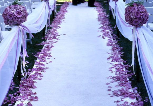 Propuestas frescas y naturales como esa alfombra de pétalos colocada directamente sobre la hierba verde del campo, u otras más sofisticadas, como esa alfombra blanca rematada con tiras de tela y pétalos de color violeta.