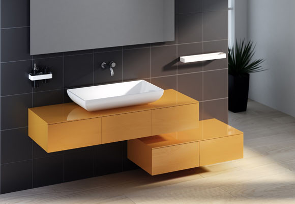 Esta colección mantiene la idea original del lavabo sobre el mostrador con cajones, con dos posibilidades ahora de altura y cuatro posibilidades de longitud, 80, 100, 120 y 150cm, y con el sistema de apertura de los cajones "push", y acabados interiores de color blanco.