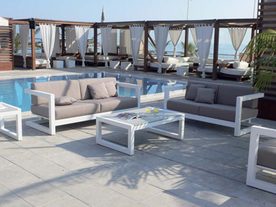 Los muebles de jardín de Weekend, están realizados en aluminio cuadrado lacado en blanco y se presentan con diferentes tonalidades de textil.