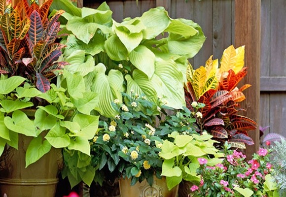 · En contraste, plantas con follaje y grandes flores de brillantes colores, bien abigarradas y de diferentes medidas para crear zonas de alto impacto visual.