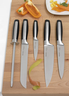 La gama cuenta con cinco artículos –cuchillo de chef, cuchillo de pan, cuchillo de carne, cuchillo general o de fruta y acero de afilar.