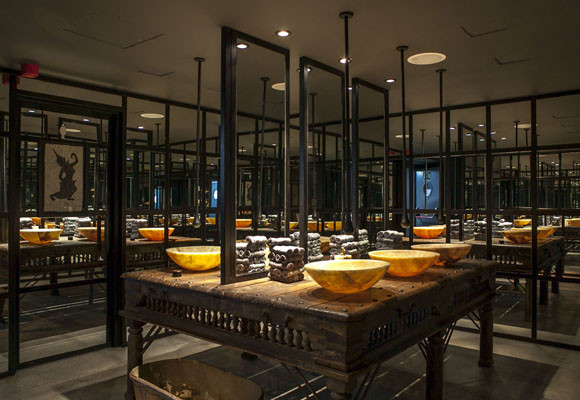 En la planta sótano se reparten la coctelería, un comedor privado con sala de estar, biblioteca y baño privado, una sala con un pequeño escenario para espectáculos, pista de baile, los lavabos, espléndidos y con una decoración espectacular, y la cocina.