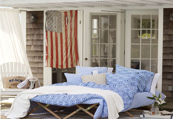 Para bajar aún más la temperatura, la cama se ha vestido con un juego de sábanas en colores muy refrescantes. Diferentes tonos de azul y un estampado que podría recrear las ondas del agua del mar o la piscina.