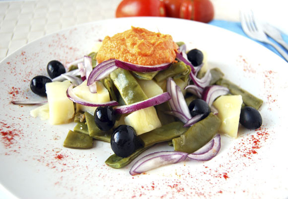 ENSALADA TEMPLADA DE JUDÍAS, PATATAS Y SALSA ROMESCO