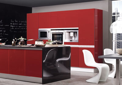 El color rojo de los muebles junto al acero inoxidable de los electrodomésticos, forman una combinación en perfecta armonía con la decoración más vanguardista.