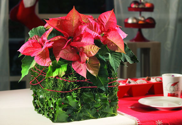Divertidos tonos verdes y rojos muy unidos, la poinsettia sobre el manto verde crea un vistoso juego de formas y colores. El color rojo en especial le da a este arreglo un tono muy vivo. Las brácteas rojo claro de la poinsettia brillan con matices coilor beige. Este arreglo tiene un aspecto ligero, holgado y divertido. La base del arreglo es compacta y de color verde oscuro, creando un efectivo contraste. Esta decoración es fácil de realizar en tan solo unos pasos.