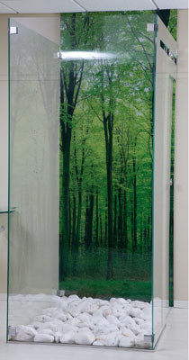Pero además, Cristal Pontevedresa personaliza también otros elementos de baño, como las columnas de ducha, los espejos o las encimeras del lavabo. Esto se consigue con la gama de vidrio esmaltado y serigrafiado, permitiendo la estampación de practicamente cualqeuir motivo decorativo, letras, logotipo...