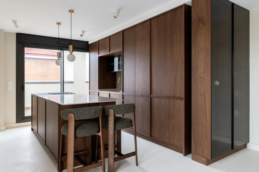 Más allá de la estética, el Japandi también es sinónimo de funcionalidad. Los sistemas de almacenaje se integran de manera discreta: despensas ocultas, cajones profundos y soluciones inteligentes que facilitan el día a día y mantienen la limpieza visual del espacio.