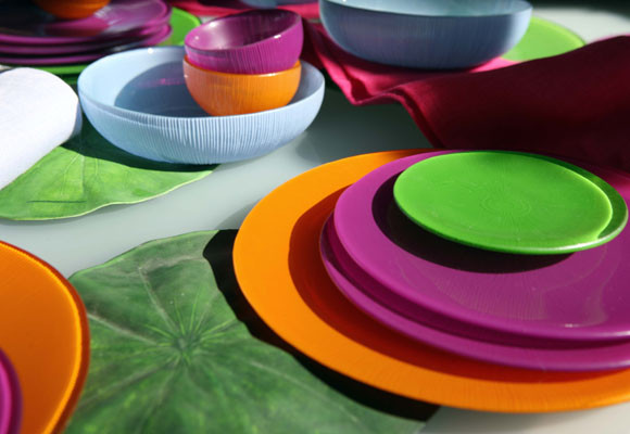 La colección está compuesta de platos, bols, vasos, copas y portavelas, disponibles en ocho colores: verde, naranja, azul, fucsia, rojo, negro, verde, pistacho y morado, así como dos acabados, cobre y plata.