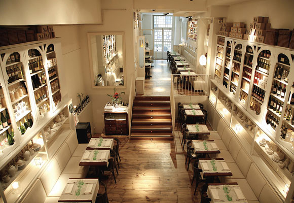 El estilo minimal chic, unido a la nostalgia por los antiguos colmados, ha sido la inspiración del reconocido Lázaro Rosa-Violán para concebir el interiorismo. Suelos y mesas de madera al natural, sillas de madera de respaldo curvo y paredes pintadas de blanco transmiten un encanto rústico.