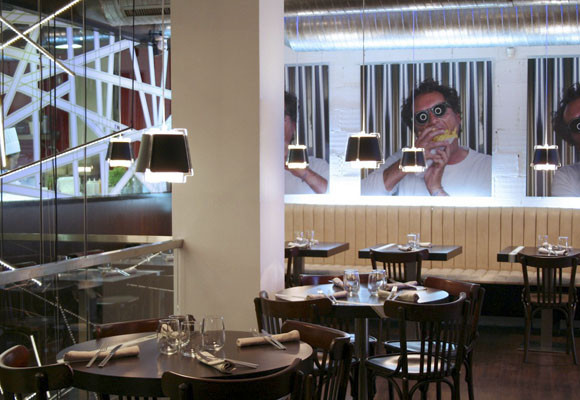 Ha sido diseñado por el conocido interiorista Luis Galliussi, siempre impactante y sorprendente. Cuenta con dos plantas en las que se salpican fotos de gente comiendo con cierto punto de locura, tiras de luz y pequeñas lámparas que caen sobre las mesas, detalles high tech y una cocina vista, donde el equipo trabaja tras un conglomerado de rayas verdes.