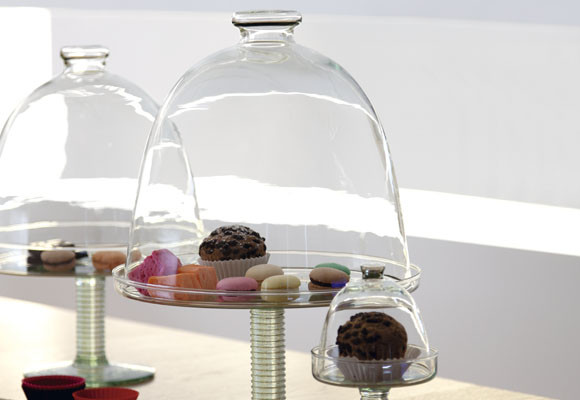 Trasparencia y forma de campana definen esta colección realizada en vidrio 100% reciclado. Una colección que no quiere ocultar el contenido para convertirlo en parte de la decoración .