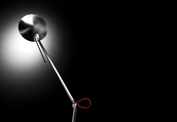 P-3007 es un pie de lectura con brazo articulable cuya pantalla circular aloja el interruptor. El punto de color lo pone el rojo del cable eléctrico, que se encuentra en la articulación de la lámpara y el agarrador, situado en la pantalla para facilitar la orientación de la luz.