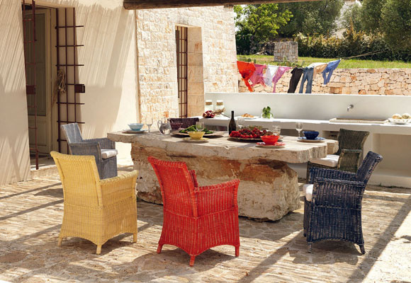 De ratán interpreta en versión moderna el tradicional sillón Carpi de mimbre en seis colores, azul, celeste, amarillo, morado y verde. Por ser una combinación perfecta de color y estilo, es ideal en ambientes tanto de exterior como de interior.