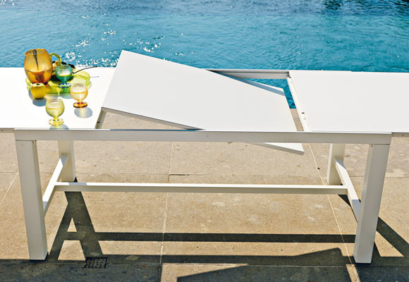 Funcionalidad y diseño lineal caracterizan la mesa extensible Conrad, de hierro galvanizado propuesta este año en los colores blanco, gris ceniciento y lavanda y en dos dimensiones.
