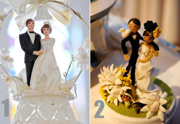 La primera propuesta es la de los novios tradicionales. La figura adecuada para una boda al estilo tradicional, por la iglesia y con un banquete multitudinario, sin embargo la segunda propuesta es más adecuada para una boda exótica, celebrada en verano, quizá en la playa, en el campo, o con una temática más natural.