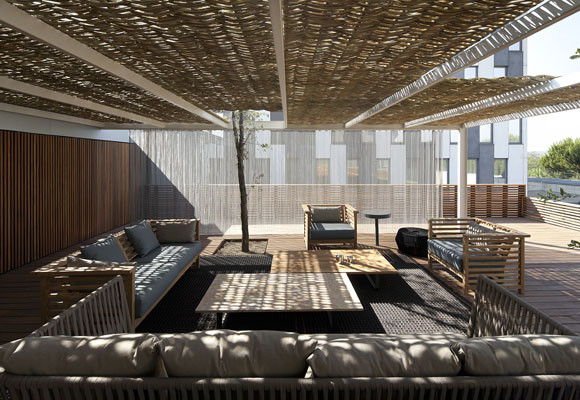 A nivel de planta baja, la intervención ha consistido en disponer de unas salas de reuniones distribuidas a lo largo de los grandes ventanales abiertos totalmente a una gran terraza, donde la creación de una gran pérgola de mimbre acoge y da protección a dos ambientes, invitando tanto a disfrutar de un espacio de relax y conversación, como de una comida informal alrededor de una gran mesa.