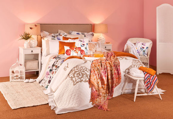 Los muebles blancos ceden el protagonismo a los complementos textiles, plagados de grandes flores en colores vivos y muy cálidos como el naranja o el mostaza, mezclados con celeste y azulón.