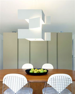 Se trata de una lámpara de suspensión con un diseño realmente atractivo. Un juego de volúmenes que nos invita a contemplarla desde los diferentes ángulos de la estancia.