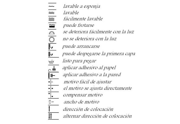 Cuando compramos papel pintado para revestir paredes, podemos ver que en la etiqueta aparecen una serie de símbolos que son muy importantes a la hora de escoger y colocar el material. Gracias a ellos podemos saber si se trata de un papel muy resistente a los lavados, o si sólo admite una suave pasada con la esponja.