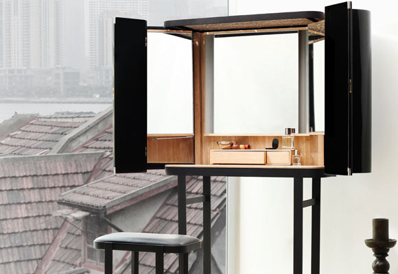 El mueble tocador The Narcissist se abre desplegando el espejo tríptico retroiluminado y se cierra a modo de secreter. El complejo mecanismo interior se esconde en la aparente simplicidad de la pieza, cuyo diseño está firmado por Neri&Hu pertenecientes a la nueva generación de arquitectos de China.