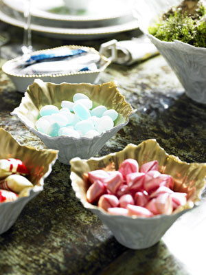 Para los más golosos. Unos pequeños recipientes dorados, llenos de dulces y caramelos de colores son suficiente aderezo para una mesa fresca, divertida, en la que los comensales acabarán dando con todo!! Incluso con los adornos!!