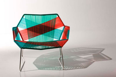 La colección consta de silla, chaise longue, sofá, sillón, hamaca.. creadas mediante una estructura tubular de acero y una trama de hilos que se cruzan y unen creando diferentes dibujos geométricos.