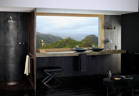 El baño que hoy os mostramos destaca sin lugar a dudas por las maravillosas vistas que se cuelan por el enorme ventanal. Un lujo al alcance de muy pocos pues hoy en día en las viviendas de nueva construcciones es difícil encontrar baños de tan generosas dimensiones, y menos con luz natural, pues la mayor parte de ellos son ciegos o sus ventanas van a dar a patios interiores.