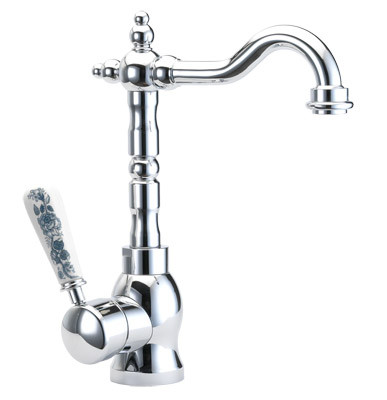Un grifo monomando de lavabo con caño giratorio que cuenta además con piezas cerámicas de la Cartuja de Sevilla.