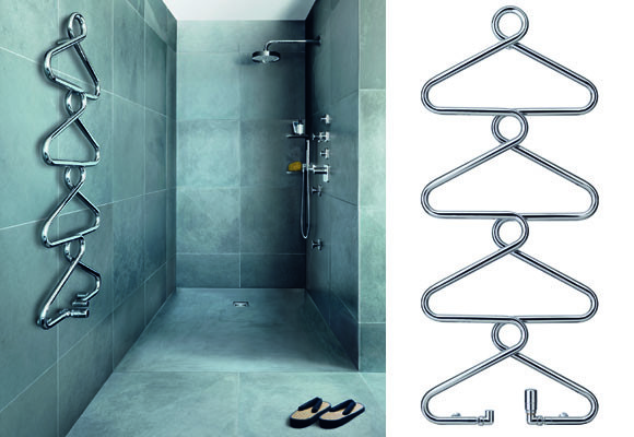 Un único tubo de acero va definiendo distintas curvas a lo largo de su recorrido, hasta conseguir una sugerente forma de sucesivas perchas que conforman el radiador. Por su estructura, se convierte en un perfecto y práctivo accesorio para el baño que permite calentar y secar cuatro toallas, a la vez que proporciona un ambiente agradable y confortable.