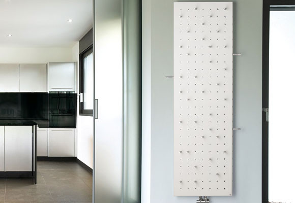 El radiador está pensado para que tenga una doble funcionalidad y cuando no está calentando el espacio también tenga una utilidad. Se compone de una serie de agujeros en los que se introducen unos tubos con imán, que pueden utilizarse como ganchos para colgar abrigos, bufandas, el casco de la moto… y pequeñas repisas sobre las que depositar objetos.