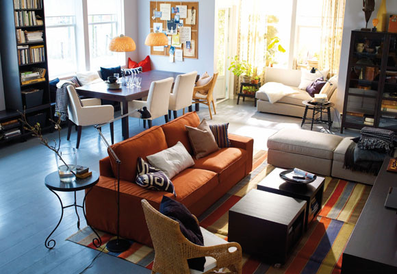 La zona principal es la de televisión, que se ha decorado con el elemento que aporta color al ambiente general, un sofá de color naranja, apoyado sobre una alfombra de rayas de colores y rodeado de otras piezas decorativas con diseños simples y colores neutros.