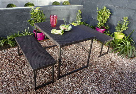 El comedor que os mostramos hoy podréis encajarlo en vuestra terraza por pequeña que ésta sea, Destaca por la sencillez de su diseño y por sus reducidas dimensiones, pero además resulta realmente sencillo de recoger y retirar ante una tormenta inesperada o si necesitamos el espacio para otra actividad.