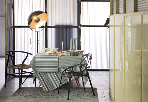 Sobre la mesa se han colocado de una forma muy divertida manteles, caminos de mesa e individuales, superpuestos unos sobre otros y cruzados, y sobre ellas encontramos servilletas, vajilla, cubiertos, velas y demás complementos necesarios para montar una mesa con todo lo necesario.