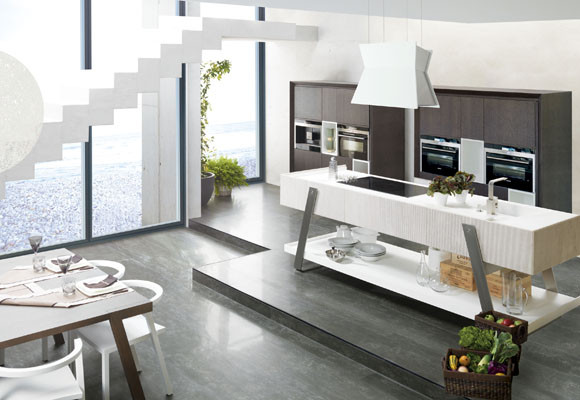 Sobre unos originales soportes de acero de diseño oblicuo se asientan los diferentes módulos que configuran este singular modelo de cocina. El hecho de que tanto la isla como las columnas de almacenamiento se encuentren semi-suspendidas en el aire, tan solo en contacto con el suelo mediante estilizadas estructuras de acero, aumenta la sensación de ligereza del conjunto y la amplitud visual del espacio.