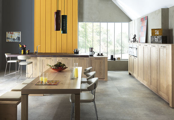 La cocina que hoy os mostramos destaca tanto por la calidez de los acabados de sus muebles, como por el frontal color calabaza.