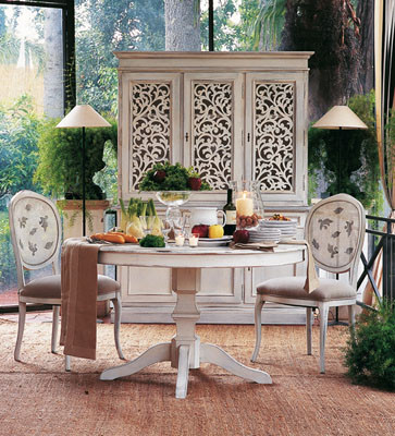 Esta línea, que se inspira en la tradición toscana, nos hace remontar a épocas pasadas. Trabajada de manera artesanal, presenta muebles en madera maciza y sillas con asiento empajado realizado a mano como antaño. Es la opción ideal para la decoración de villas y casas de campo.