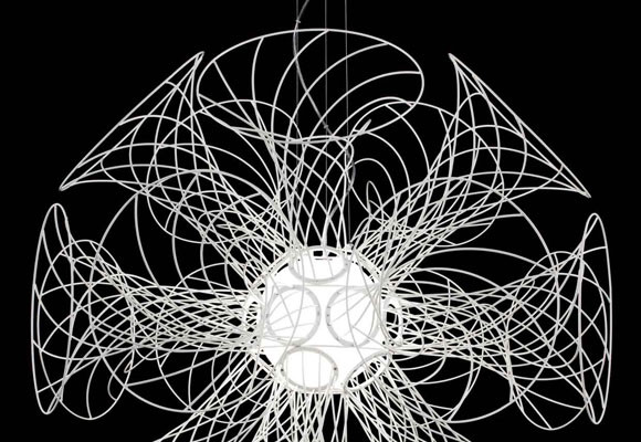 Los elementos que componen la lámpara han sido diseñados para parecer suspendidos en el aire, sujetos únicamente por la fuerza magnética de la luz y por tanto, de la fuente luminosa.